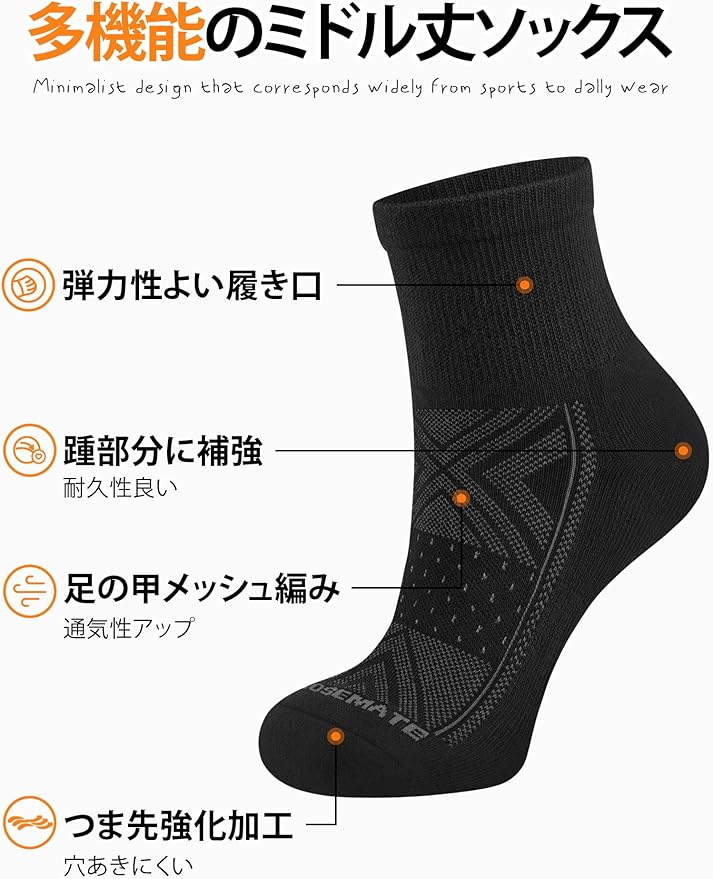 【CLOSEMATE スポーツソックス】 日常生活は無論、ランニング、ハイキング、ジムなどのスポーツシーンにもオススメのソックスです。動きやすく、履き心地のいいソックスです。 ・快適サポート設計:土踏まずを持ち上げ荷重を分散させるアーチサポート設計で快適な履き心地。動いた時のズレ・ずり込みも避けします。運動時に喜ばしい吸汗速乾機能や、抗菌防臭加工も施しています。さらにつま先かかとは、丈夫なクッションパイル編みです。豊富なカラー展開で気分や、コーデに合わせてお楽しみいただけます。 ・アーチサポート設計・足首サポート機能・甲側メッシュ。 ・左右設計・つま先かかとクッションパイル編み。 ・吸汗速乾加工・抗菌防臭加工・クルー丈。