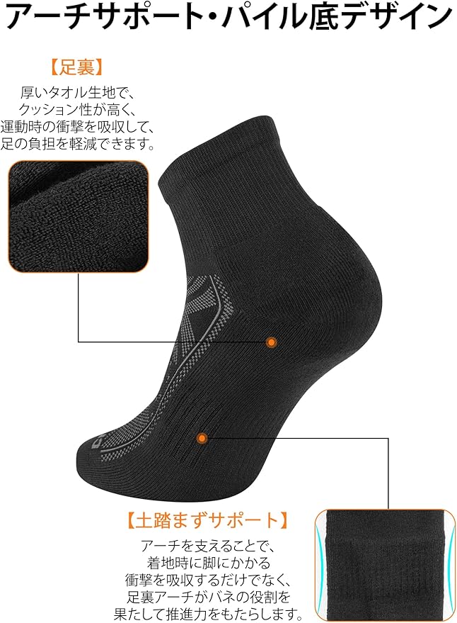 【パイル底デザイン】足底が厚いタオル生地を加工され、クッション性が高く、運動時の衝撃を吸収して、足の負担を軽減できます。足裏が普通より厚くなってだから、磨耗に耐えられ、穴あきにくくなります。