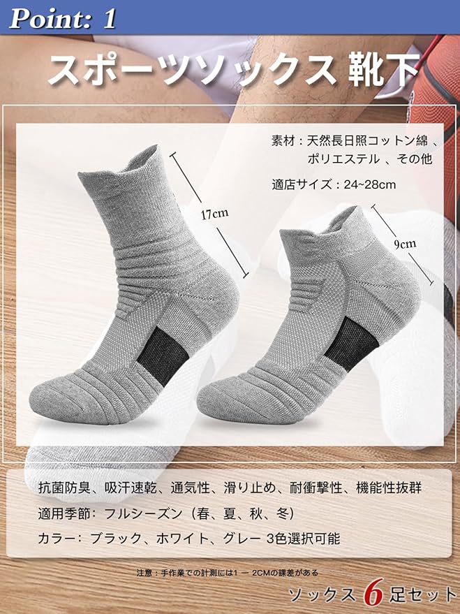 【商品仕様】6足セット、サイズ:24-28cm 。素材:90%の綿+10%ポリエステル。通気、吸湿、抗菌 防臭効果のおかげで長時間運動したり歩いたりしても臭いはありません、一日中快適に着用できます。ランニング、サッカー、バスケットボール、トレーニングなどのさまざまなスポーツに適しています。