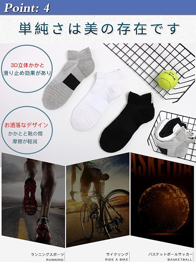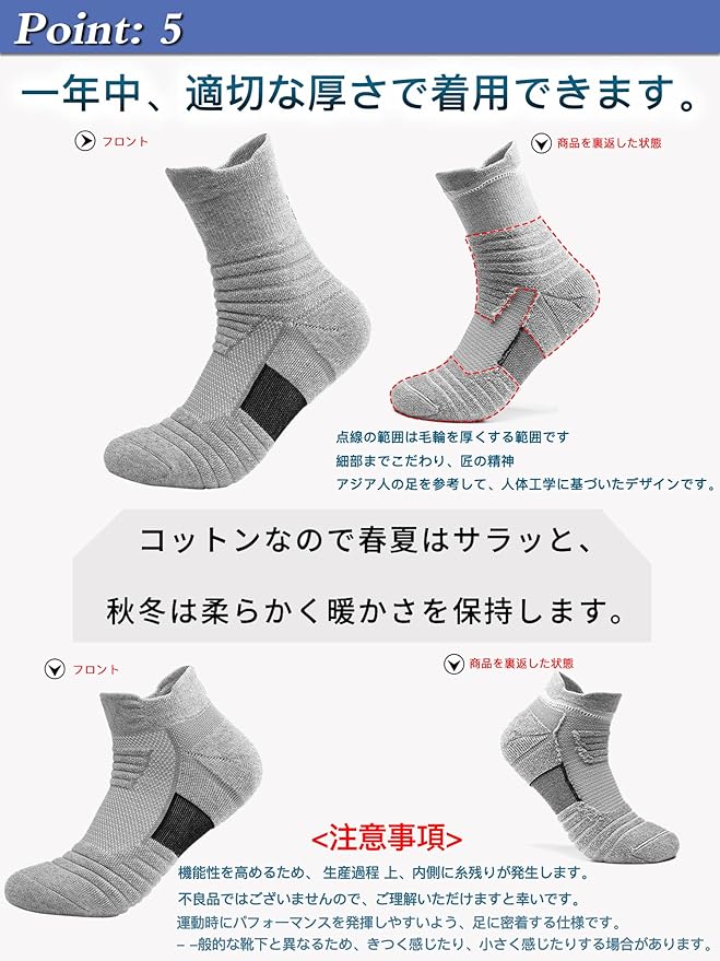 【肌触りと耐久性も抜群です】天然長日照コットンを採用した故、毛落ちや毛玉が発生しにくく、水洗いでも色落ちや収縮が発生せず、柔らかくて通気性も優れており。つま先、甲、かかとを全方向に補強します、足ズレを防止できるし、衝撃を受けた時足を守ることもできます。通気メッシュを加えて、熱気を発散させ、いつまでも快適のままにいられます。
