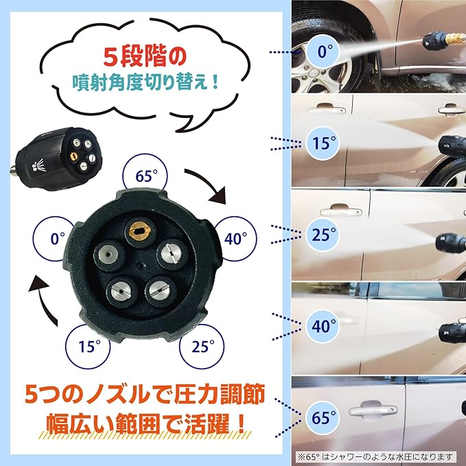 【5段階調整ノズル付き】付属の5in1ケルヒャーノズルは、0 ・15 ・25 ・40 ・フォームガン噴射の5段階切替えが可能です。車の洗車時、ボディ・タイヤ・下回り・ホイールの部位ごとに適した水圧が選べ、洗浄効率アップ。高圧洗浄ショートガンとケルヒャーガンノズルの組み合わせで、頑固な泥汚れもラクラク除去。