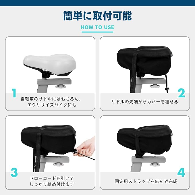 【簡単装着&工具不要】 サドル先端から被せてドローコードを絞り、ストラップで固定するだけの簡単取り付け。フィットネスバイク カバー、エアロバイク クッションとしてもすぐに利用可能。サドル 柔らかい・サドル クッションを手軽に追加できます。