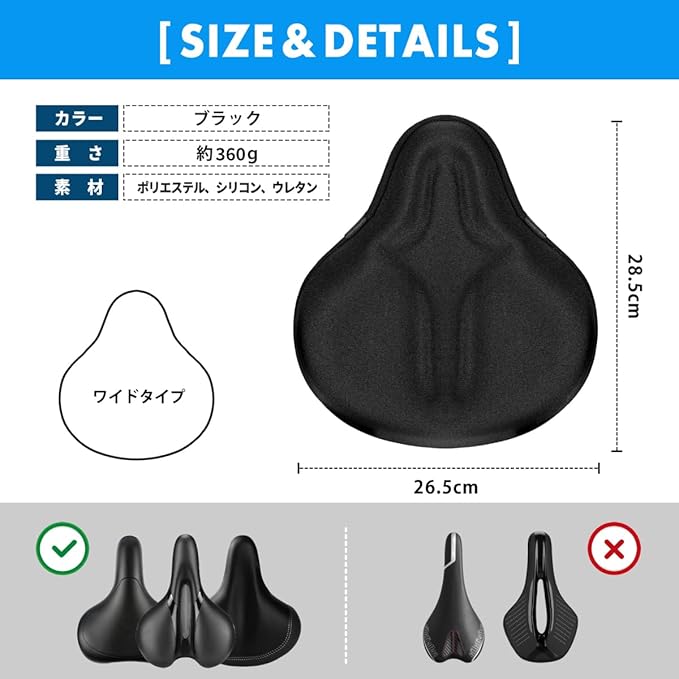 【幅広い自転車に対応】 26.5 28.5cmの大きめサイズで、シティサイクル サドル、ママチャリ、クロスバイク、電動自転車、エアロバイク、フィットネスバイクなど多種多様に対応。極厚サドルカバー・サドルゲルカバー・サドルカバー ジェルクッションとして幅広く活用可能です。※細身のスポーツサドル(幅18cm未満)は非対応。