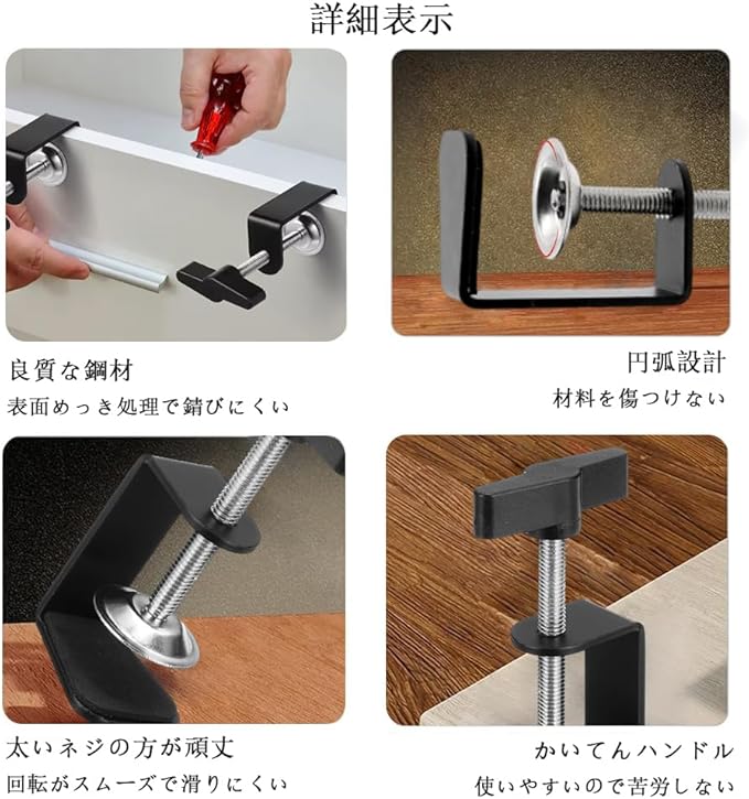 【安定設計】シンプルで安定した設計で、クランプを必要な材料に固定するだけで、多様な機能を兼ね備えたツールになります。治具としてもよいし、フックとしてもよい。 【多様な用途】固定デスクから木工、家具製作までをサポート。さまざまな厚さ、形状の材料をしっかり固定します。家庭でのDIY活動に最適で、多機能ツールとして使用できます。