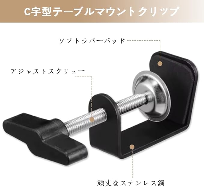 【商品仕様】C型クランプは2個、最大開口幅45 mm。開口距離を自由に調節でき、10 mm~45 mmの各種素材を固定できる。