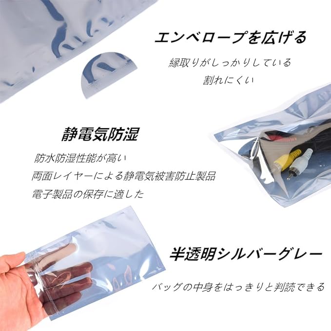 【セット内容・材質】セットには静電気防止袋が20枚入っています、CPP/PET製、厚さ0.15 mm、壊れにくく、無毒で異臭がなく、両面帯電防止層、帯電防止効果がより良い。