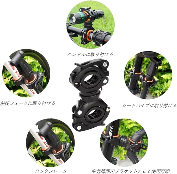 【多目的】自転車の懐中電灯のクリップだけでなく、自転車のポンプやエクステンションブラケットにも、ハンドルバー、シートポスト、リアフォークに取り付けることができます。