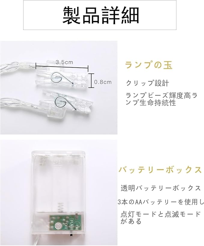 【製品仕様】:クロストークランプの全長は3メートルで、20個のLEDはっきりしたフォトクリップを備えており、フォトクリップ間の間隔は10センチである。電線は曲げ可能な銅線で作られており、希望の形状に合うことができます。