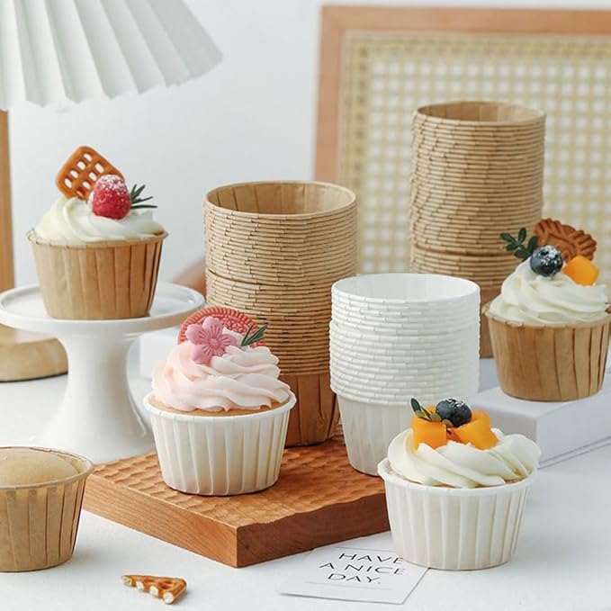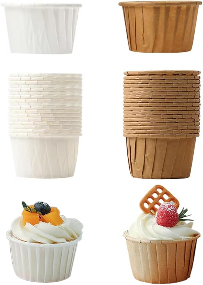【セット内容・素材】ケーキベイクカップ100個入り(白+カレー色)、純木材パルプ紙から作られ、高温に強く、変形しにくい。