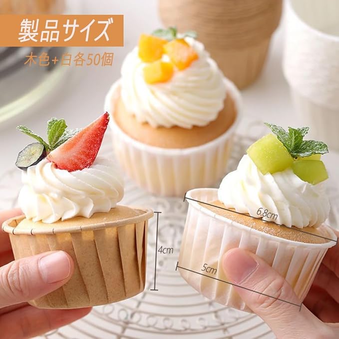 マフィンカップ プ ケーキ型 ベーキングカップ ケーキカップ 剥がれやすい 耐熱 防水 耐油 DIY製菓用品 家庭用 ケーキ屋さん用 (木色+白(各50個))