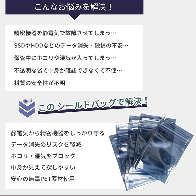 【静電気から守る保管袋】 帯電防止性能に優れたCPP/A-PET素材を採用し、静電気による電子部品の故障や劣化を未然に防ぐ静電気防止袋です。ICチップ、SSD、基板、メモリなどの精密機器を安全に保管・輸送するために設計されており、パーツの信頼性を高めたい方におすすめです。