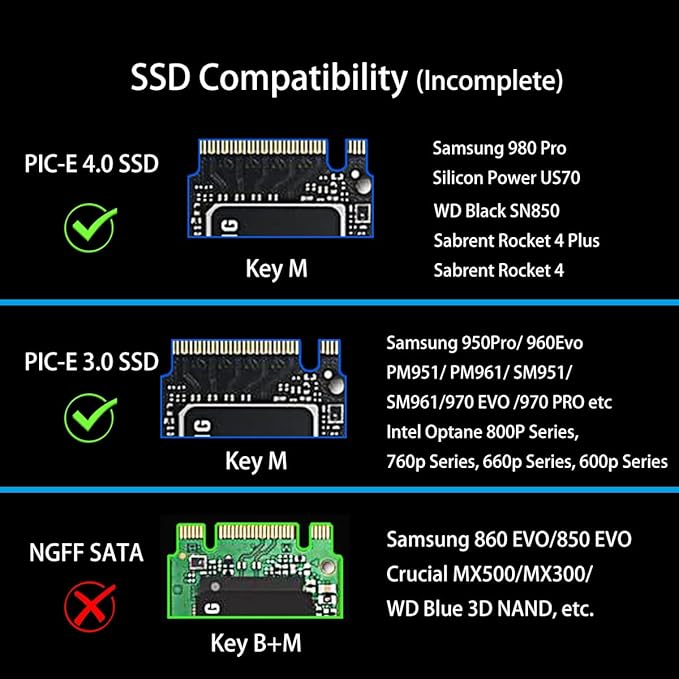 OS互換性: Windows 11/10/8/Linux/Mac OSでプラグ & プレイ(注:Windows 7をサポートしない)。新しいM.2 NVMe SSDは、コンピュータのホストによって認識される前に初期化とフォーマットされる必要があります。