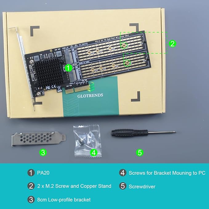 GLOTRENDS PA20 2ポート M.2 NVMe - PCIe 3.0 X4変換 拡張カード、PCIe分岐機能対応、M.2 NVMe SSD Soft-RAID対応、22110/2280/2260/2242/2230サイズ対応
