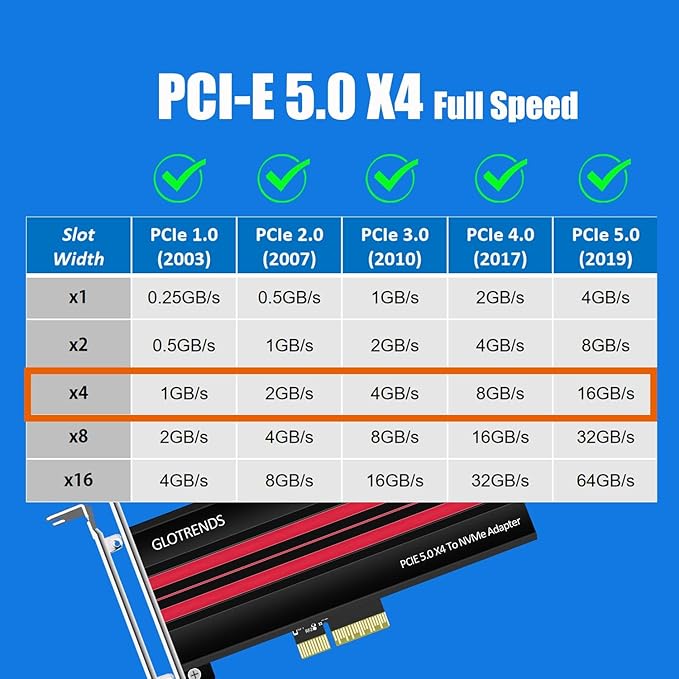 PCIe 5.0 X4(64Gbps)のフルスピードを実現するには、CPU、マザーボードのPCIeスロット、PCIe M.2 SSDのすべてがPCIe 5.0をサポートしている必要があります。