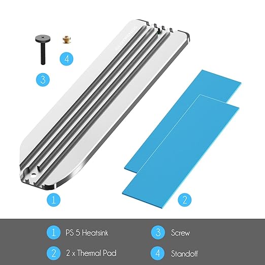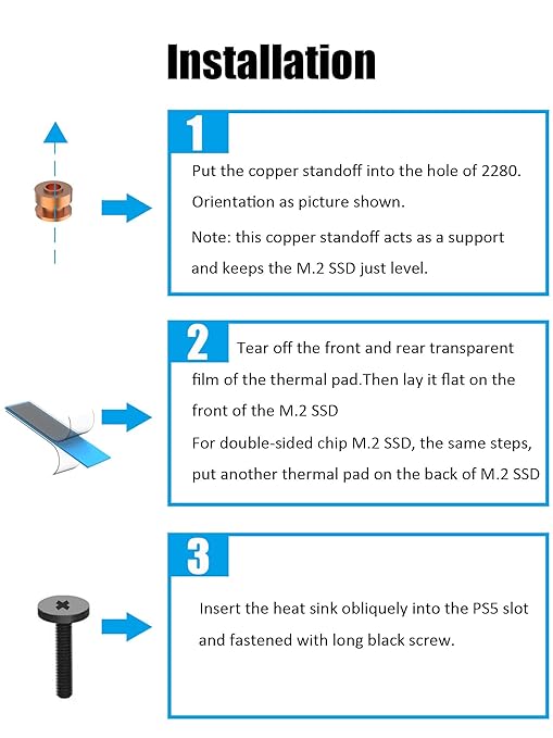 このPS5 ヒートシンクを取り付けるには、銅製のスタンドオフ、サーマルパッドとネジが必要です。銅製のスタンドオフはM.2 SSDを水平位置でサポートし、サーマルパッド(熱伝導パッド)はM.2 SSDとヒートシンクの下面との間の完全な接触を保証します。