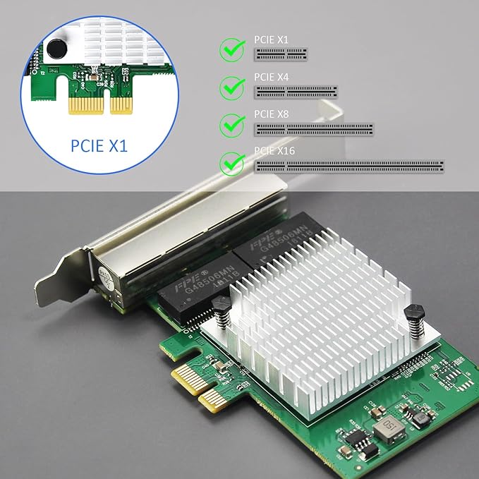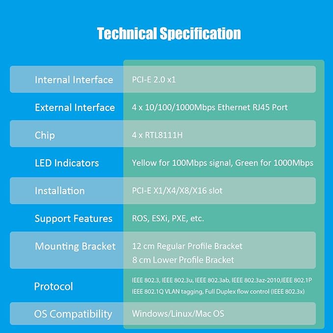 【フルスピード動作】RTL8111Hチップをベースに、アップストリーム帯域幅はPCIe 2.0 X1=5Gbpsで、4つのポートが1000Mbpsのフルスピードで同時に動作します。 (注:取り付けに必要なPCIE X1スロットは1つだけです。PCIE X16スロットを無駄にすることはありません)。