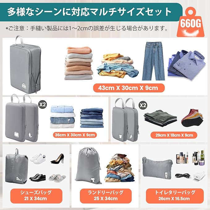 【8点セットでスマート収納】XLサイズ(43 30 9cm)、Lサイズ(36 30 9cm)*2、Sサイズ(29 18 9cm)*2の衣類収納ポーチに加え、シューズバッグ(21 34cm)、トイレタリーバッグ(26 16.5cm)と巾着袋(25 34cm)の充実セット。清潔な衣類と汚れた洗濯物を分けて収納できるから、スーツケース内が衛生的に整理でき、旅行中のストレス軽減に大活躍!