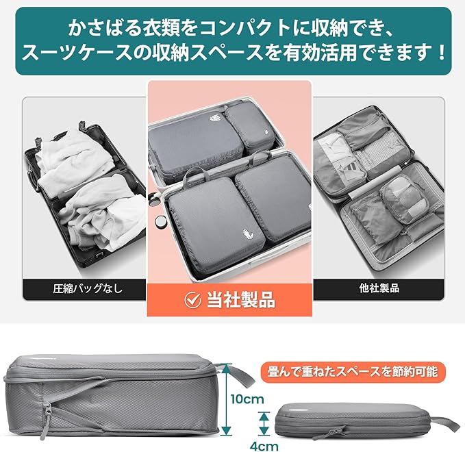 【かんたん圧縮でスペース50%OFF】特別設計の強化SBSファスナーを閉めるだけで衣類を簡単圧縮。面倒なポンプや専用器具は不要なので、お子様からご年配の方まで誰でもラクラク操作可能。かさばる衣類もコンパクトに圧縮できるから、スーツケースの収納効率が劇的にアップ!