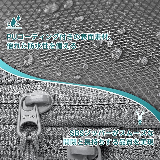 【プロ仕様の高耐久設計】表面に施したPUコーティングが水染みを完全ブロック。衣類を常に清潔に保ちます。さらに強化型SBSジッパー採用で、何度開閉してもスムーズな使い心地。旅行の厳しい条件にも耐える、本格派の耐久性を実現しました。
