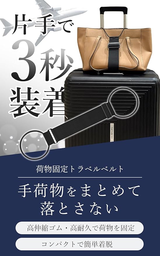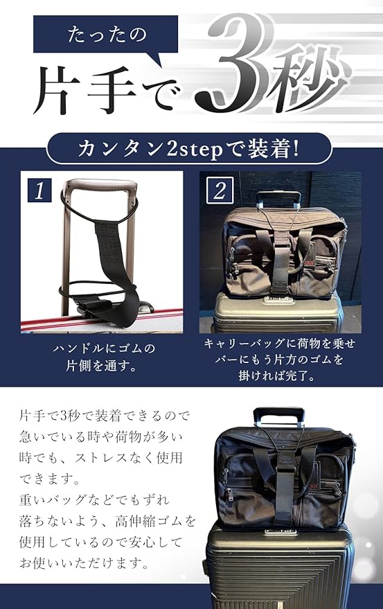 ✅【簡単な使い方】 スライドハンドル付旅行用鞄に使用 スライドハンドルに片側のゴムをかけ、ベルトの上に載せる荷物をおき、もう一方のゴムをハンドルにかける ゴムを両方ハンドルにかけ、ベルト部にストールやミニバックをかけることも可 使用しないときはコンパクトに収納できるので、旅のお供におすすめ。