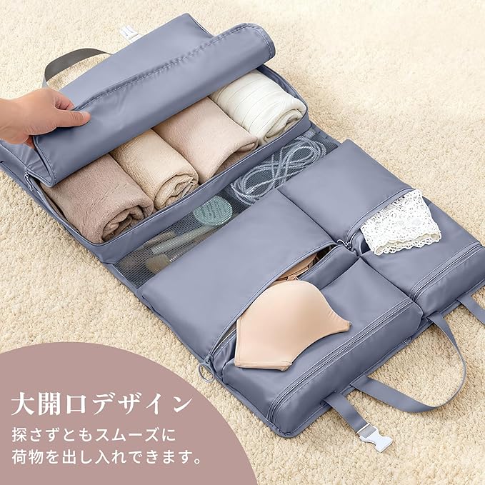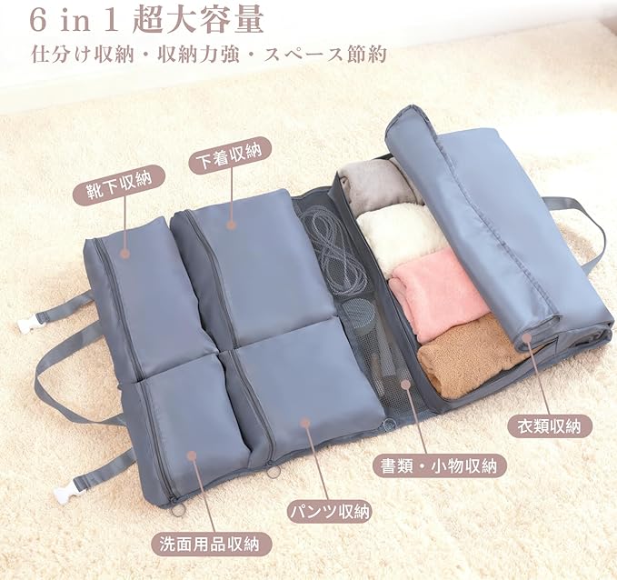【6in1多機能&大容量収納】6つの独立した収納スペースが、衣類、下着、靴下、化粧品、小物などをすっきり分類。旅行や出張の荷物整理が格段に楽になり、効率的なパッキングを実現します。