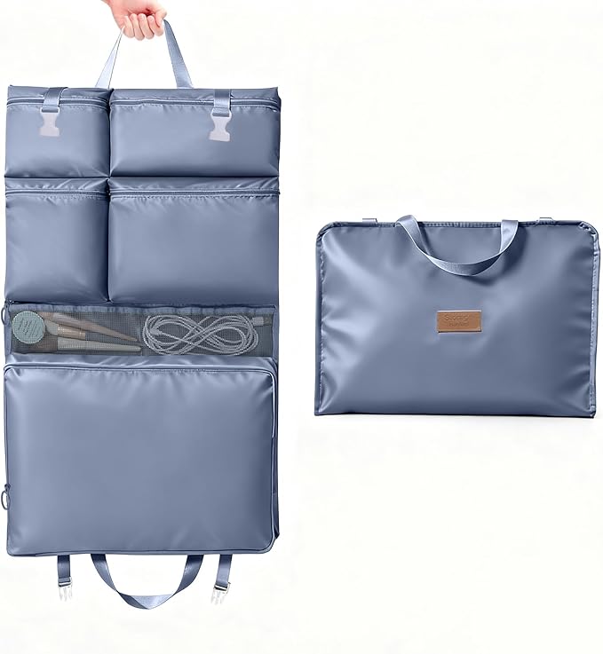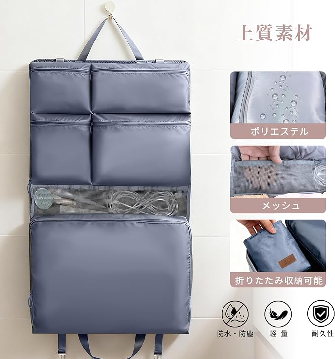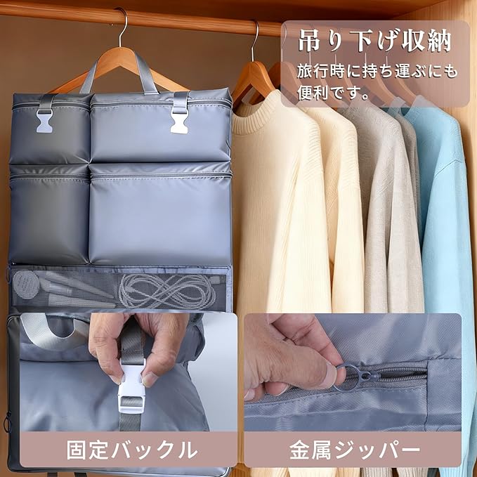 【手提げ・吊り下げ両用&省スペース】手提げベルト付きでクローゼットやドアに吊り下げ可能。裏面に専用固定ベルトあり、スーツケースロッドに固定でき、移動が楽々。使用しない時はコンパクトに折りたためるので、収納場所を選びません。
