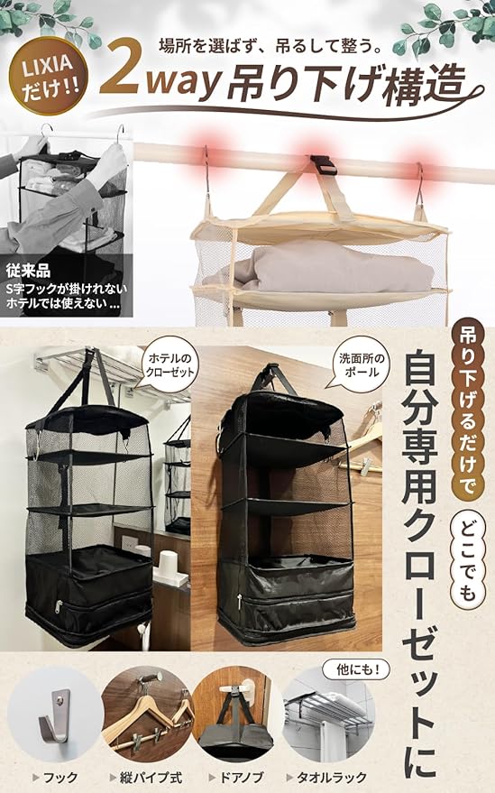✅【掛け方2通り、圧縮方法2通り】 LIXIAのトラベルポーチはフックでの掛け方に加えて中央のベルトでも吊り下げることが可能に。従来のポールに掛けるという使い方だけでなく、洗面所のタオルラックやドアノブ、ハンガー掛けなど様々な場所が自分専用衣類収納棚に変身! 3点掛けもできるので荷物が安定し、耐荷重もUP。※最大耐重量 約10kg以内