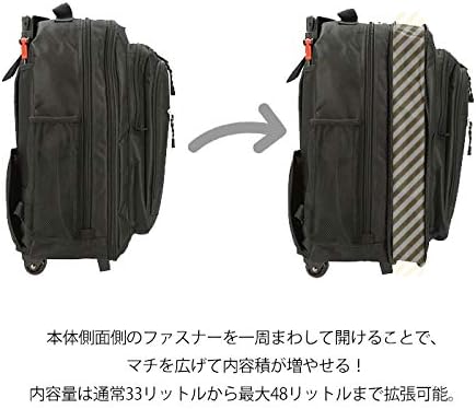 『引く』『持つ』『背負う』と3通りの使い方ができるので、シーンに合わせてお使いいただけるリュック式キャリーバッグ。 男性はもちろん、女性やお子様もお使いいただけるアイテムです。 メインスペースは開閉しやすいダブルジップを採用。衣類なら2泊程度が十分に収納可能な大容量サイズ。 出先で荷物が増えても安心なマチ幅拡張機能を搭載。(約8cmアップ) 本体のサイドにメッシュポケットを配置しているので、ペットボトルや小物類など必要な時にサッとアクセスできます。 キャリーバーは多段階に調節可能。スタイルに合わせた最適な高さに設定できます。 キャスターは2輪式を採用。安定性がありスムーズな走行が可能。 幅広い年代の方にお使いいただけるバッグです。