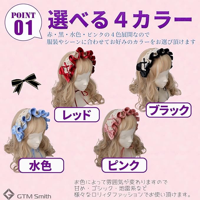 選べる4カラー:赤・黒・水色・ピンクの4色展開なので、服装やシーンに合わせてお好みのカラーをお選び頂けます。お色によって雰囲気が変わりますので、甘め・ゴシック・地雷系など様々なロリィタファッションでお使い頂けます。