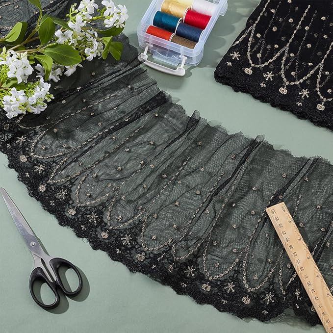 BENECREAT 5ヤード/4.57m レースリボン ブラック 237mm幅 刺繍リボン 幅広刺繍レース縫製トリム ゴスロリ風 ロリータ コスプレ DIYクラフト縫製、服装装飾、衣装小物、ウェディングドレス用