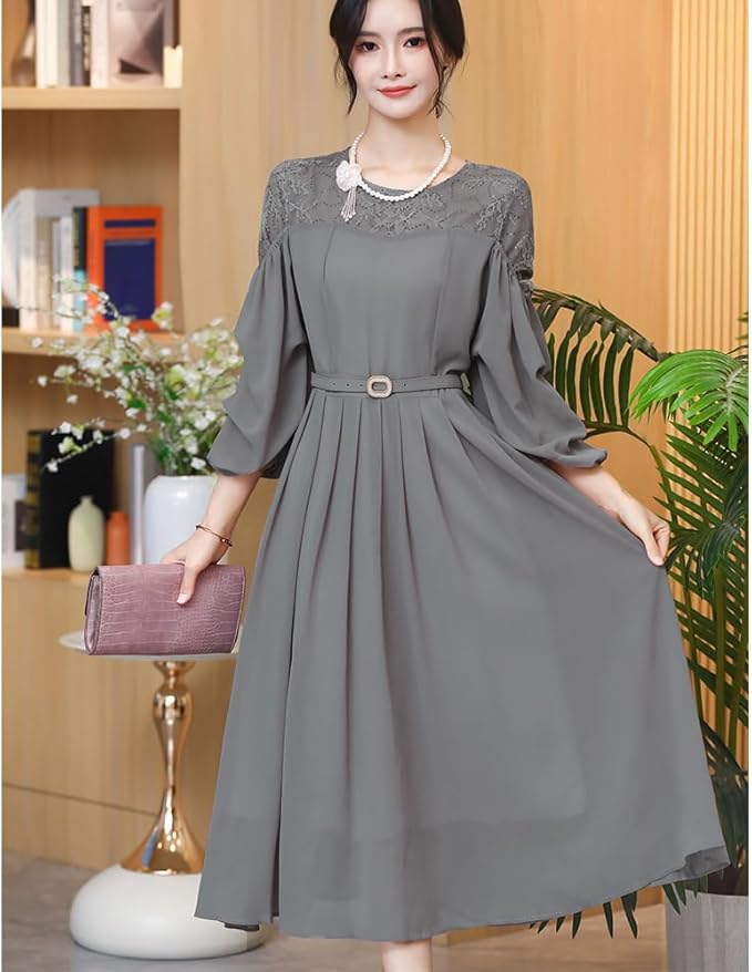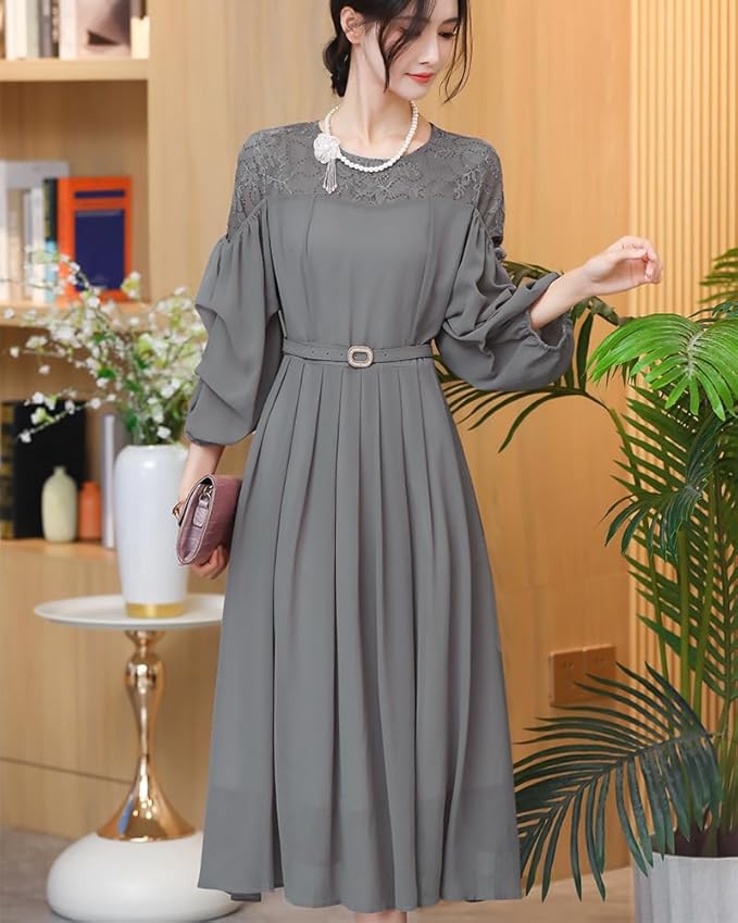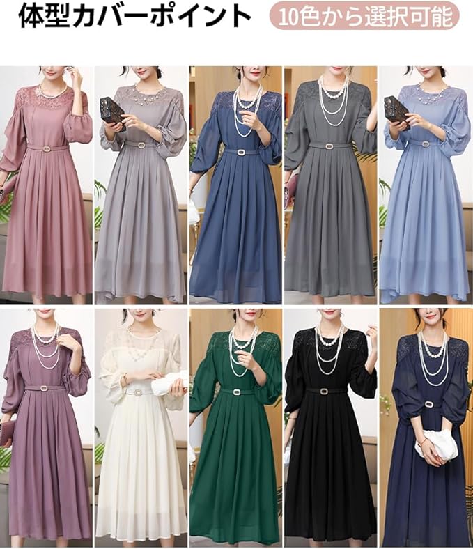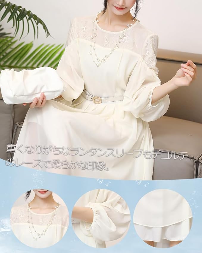 [Collecala] ドレス レディース 肩レース切り替え ロング ミモレ丈 ランタンスリーブ5分袖 フレア Aライン 可愛い ハイウエスト 着痩せ おしゃれ 取り外しベルト 裏地付き きれいめパーティー 結婚式 通勤 二次会ドレス