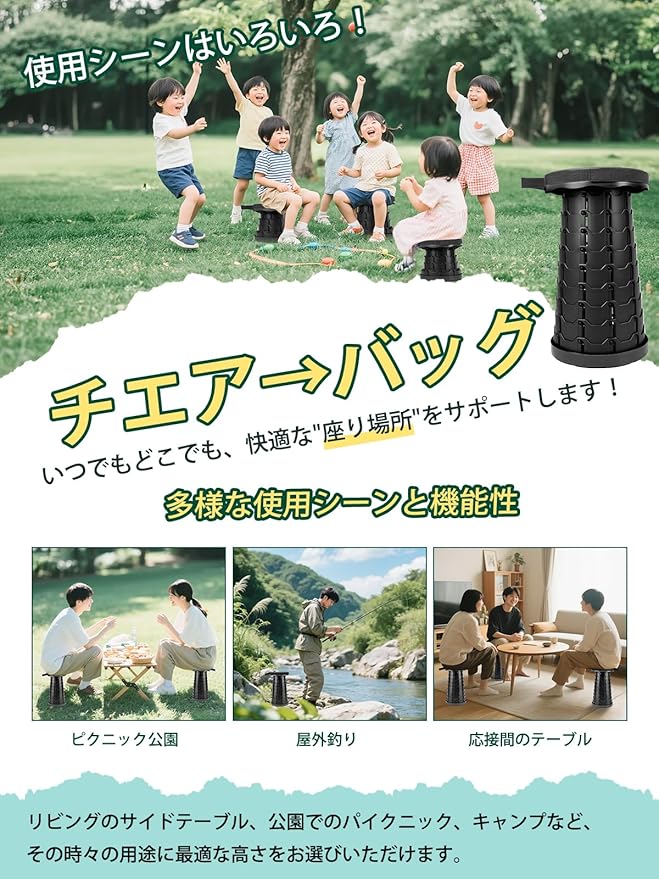 【多彩なシーンで活躍する万能チェア】家庭用としては玄関の踏み台や受付椅子として、アウトドアではキャンプ椅子やバーベキュー、釣り、花見、スポーツ観戦など、幅広いシーンで活躍。コンパクトながらも十分な座面の広さを確保し、日本人の体型に合わせた設計で、長時間の使用でも疲れにくいのが特長。一家に一つあると重宝する、まさにマルチな折りたたみ椅子です。