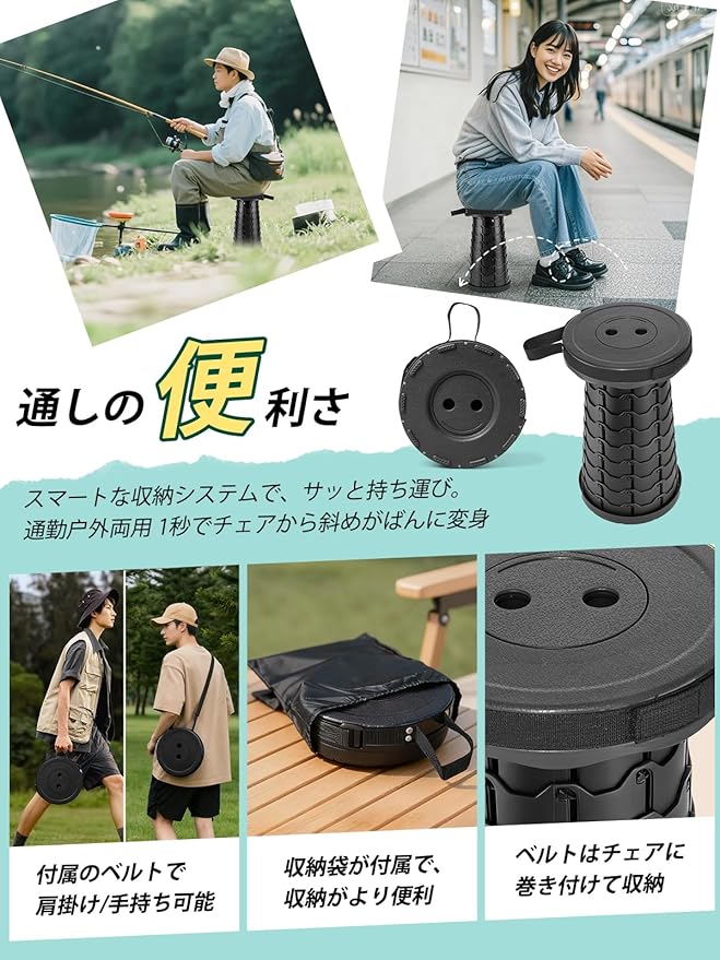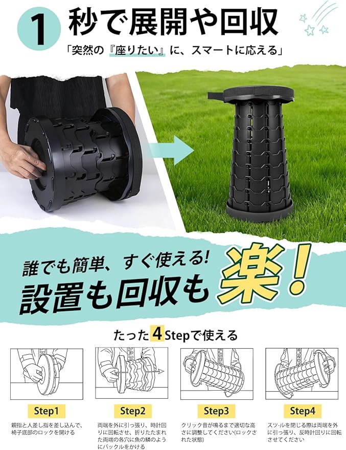 【使いやすさと自由な高さ調節】この伸縮折りたたみ椅子は、ワンタッチでわずか1秒の簡単開閉を実現。6.5cmの低姿勢から45cmの標準座面高さまで、12段階で細かく調整可能。室内では踏み台として、アウトドアではキャンプ椅子として、あらゆるシーンに合わせて最適な高さにお選びいただけます。コンパクトに畳めば直径25cm 高さ6.5cmのスリムな円盤状に。クローゼットの隙間や車のトランクなど、限られた収納スペースにもすっきり収まります。