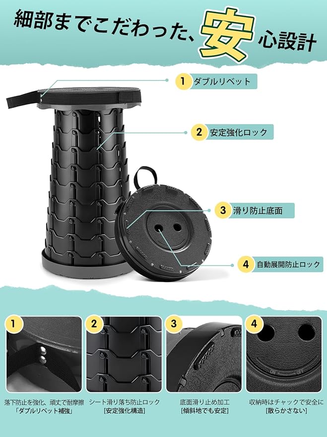 【完全防水・滑り止めでアウトドアに最適】本体は高品質プラスチック製のため、本来優れた防水性を備えています。雨天や海辺、湿気の多い環境でも、錆びる心配がなくお手入れも簡単。底部には4箇所に滑り止めゴムを配置し、傾斜地でもずれにくい設計です。波紋状の支持構造と中心部の強化バネが、25度の傾斜でも転倒しにくい安定性を実現し、アウトドア使用に最適です。