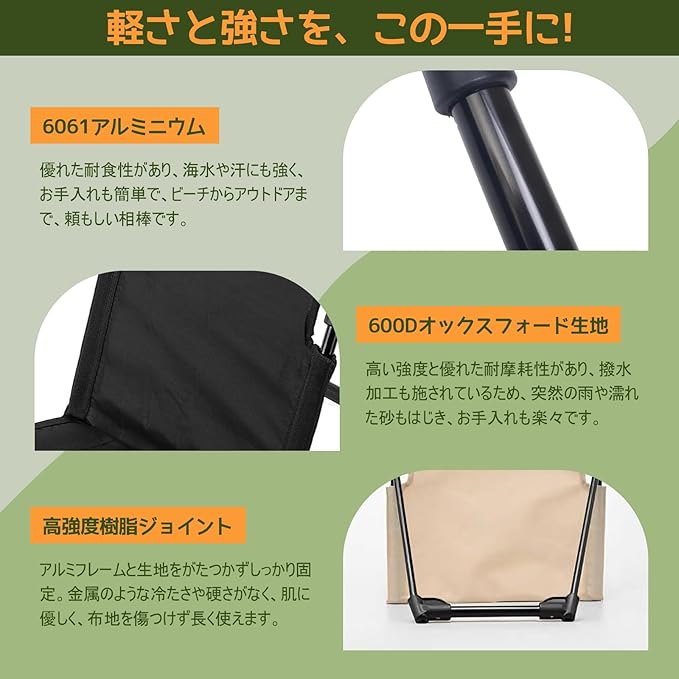 Raisme アウトドア座椅子の耐久性フレーム(最大耐荷重120kg)で、安定した座り心地を実現。 ◦ アルミ合金素材使用でサビにくく、雨や土汚れにも強い。