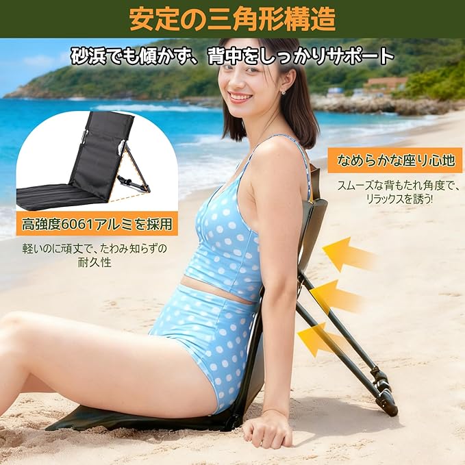 Raisme アウトドア座椅子は多機能設計:収納袋付きで移動中も清潔、立体的な座面で地面の凹凸を吸収。 河原や山道など不安定な地形でも安心。