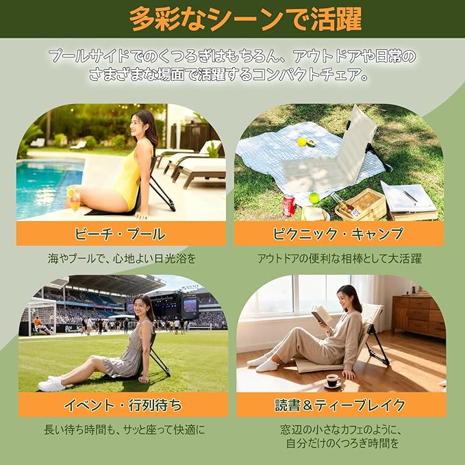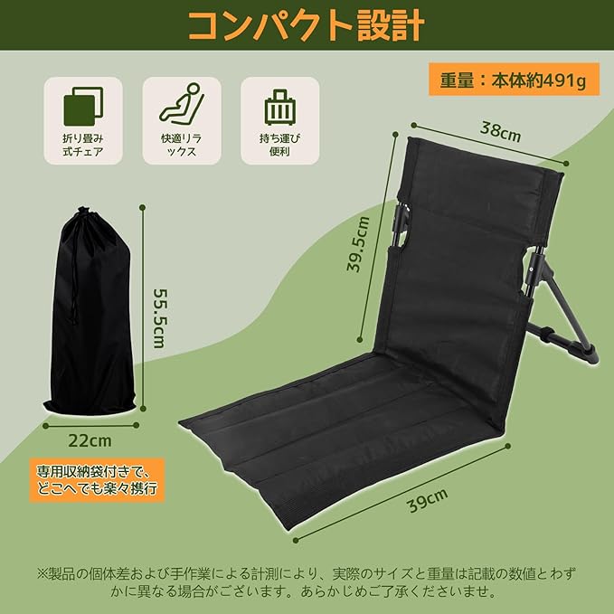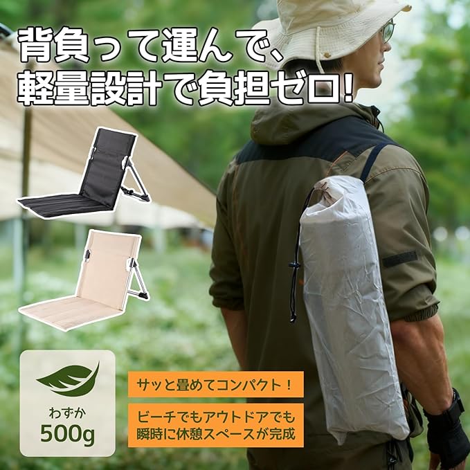 アウトドア座椅子 超軽量 コンパクト 折りたたみ椅子 背もたれ付き クッション 収納袋付き - キャンプ、フィールド、ピクニックに最適 - アウトドア愛好者 家族向け (ブラック)