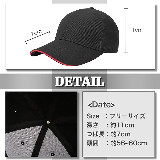 サイズ:フリーサイズ(頭囲約58cm、後部マジックテープで調整可能です) 深さ 約11cm / ツバ 約7cm