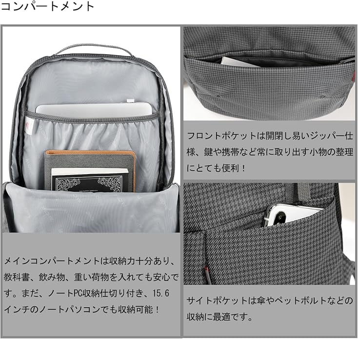 【収納力】28Lの大容量ザック。多きめなメインポケット1つ、フロントジッパーポケット1つ、サイドオーペンポケット2つ。メインスペースにはA4雑誌はもちろん、財布、雑誌、着物、傘などをたっぷり収納可能です。また、15.6インチノートパソコンまで収納できるのクッション内蔵のオープンポケットが付いていて、PC収納リュックとしても便利です。