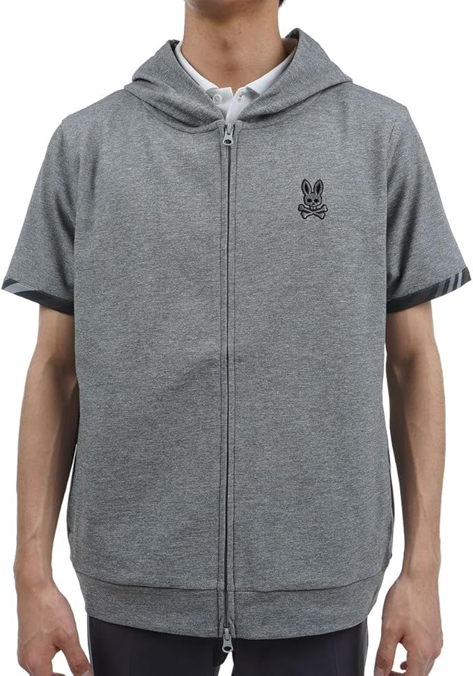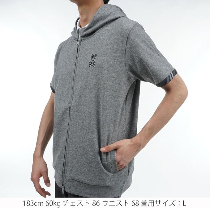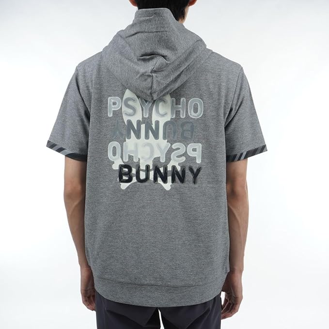 【生地】裏がメッシュになった張りのあるポンチ素材を使用した半袖ジップパーカ。【デザイン】バックプリントにサイコバニーらしい大胆なアートワークをあしらいました。袖口とフード裏のプリントもリンクしておりシンプルながらもアクセントが効いた1着。インナーに長袖コンプレッションや半袖モックネックをいれたレイヤードスタイルもおすすめ。ジップ仕様なので羽織としても活躍します。中国製※サンプルを着用しておりますので、実際の商品と仕様、加工、サイズが若干異なる場合がございますが予めご了承くださいませ。