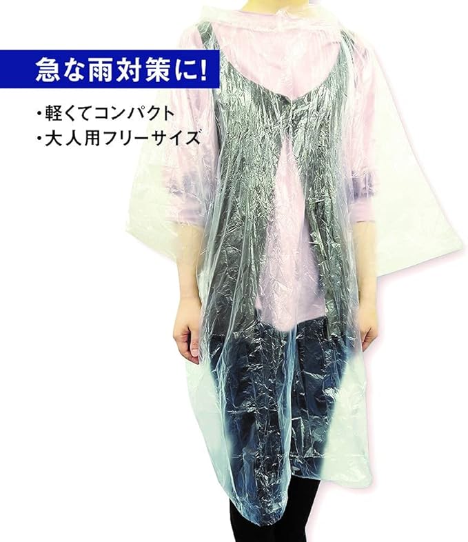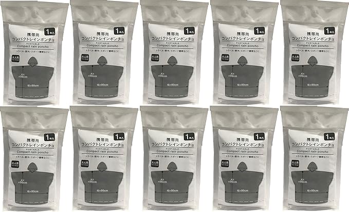 とにかくコンパクトで携帯に便利なレインポンチョ。 携帯時サイズ 縦約12cm横約7cm厚み約1cm。 大人用フリーサイズ 着丈約96cm幅約90cm。普段からポーチやカバン、ポケットに入れておいても邪魔になりません。トラベル、野外ライブ、スポーツ観戦などでの急な雨に。まとめ買いにピッタリな10枚セット。