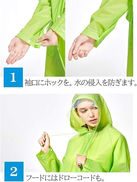 ✅【快適な使用感】携帯用の収納袋から取り出してさっと羽織るだけで使えるため簡単です。フードにつけられた透明のツバ、首元のドローコード、袖口のスナップボタンなど、雨に濡れにくい工夫がされています。