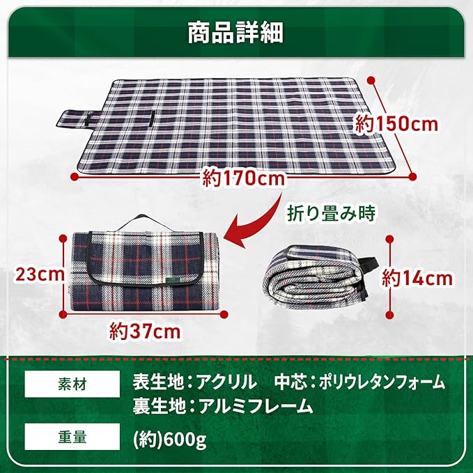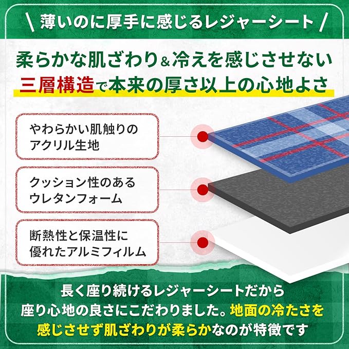 柔らかな肌触りと、冷えを感じさせない三層構造。地面の冷たさを感じさせず肌ざわりが柔らかなのが特徴。クッション性もあるので、座り心地が抜群。