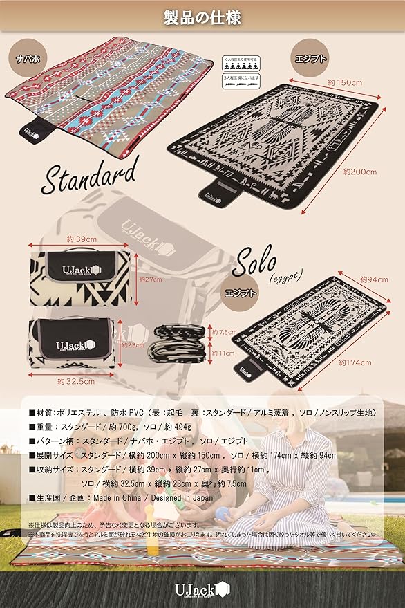 サイズ:展開時(スタンダード)200cm x 150cm (SOLO)174cm x 94cm 収納時(スタンダード)39cm x 27cm x 11cm (SOLO)32.5cm x 23cm x 7.5cm 縦横にマジックテープを使用して連結可能です。