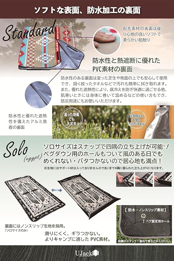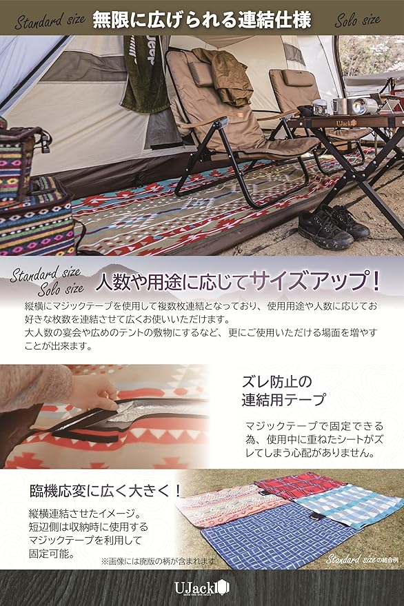 ソフトな表面&防水加工の裏面:レジャーシートは表面が柔らかなフリース(起毛)素材と裏面が防水性の高いPVC素材、SOLOは裏面ノンスリップ生地となります。起毛素材の表面は座り心地の良いソフトで優しい肌触りで、肌寒いときには身体を温めるためにもお使いいただけます。防水性のある裏面は湿った芝生や地面の上でも安心して使用でき、固く絞った雑巾などで汚れも簡単に拭き取れます。 これ一つで大人3~4人程度の使用が出来ますが連結機能を使用していただくと大人数の宴会などにもご使用いただくことができます。