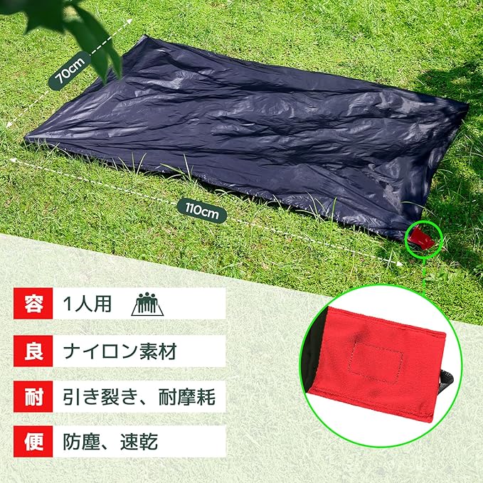 軽量ポケット レジャーシート: 1人用で、展開サイズは110 70cm、収納袋は8 5cm、重さは36グラムです。
