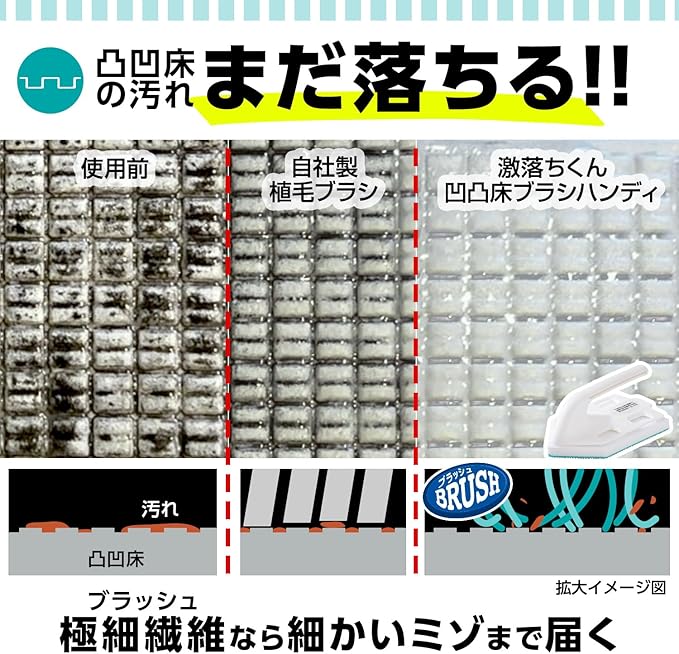 密集した極細ブラシが、浴室の凸凹床の細かい溝に届いて汚れ・黒ずみを落とします。
