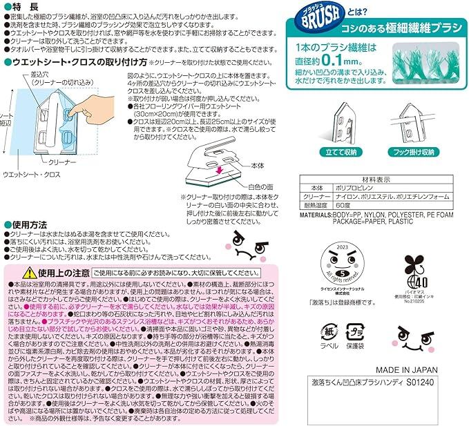 ●浴室の凸凹床を掃除するハンディタイプのブラシです。 ●水だけで汚れをブラッシングできるブラシ・窓や網戸掃除用ウェットシート取り付けの2WAY機能 ●凸凹床の溝にも届く、1本約0.1mmのブラシ繊維を高密度に織り込んだ「BRUSH(ブラッシュ)」を採用しております。 ●ウェットシートを取り付けることで、窓や網戸の掃除にも使えます。 ●クリーナーは取り外して洗うことができます。