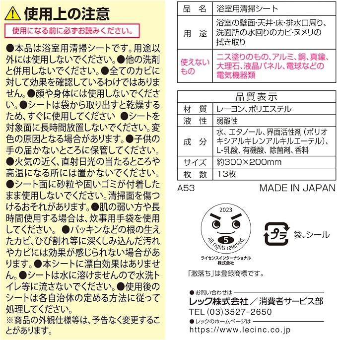 シートは乳酸配合で、拭くだけでカビの原因菌を除去します(※全てのカビに対して効果がある訳ではありません)