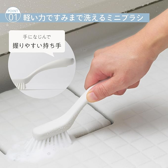 【握りやすいミニブラシ】GOOD DESIGN賞受賞(※)。握りやすく、力を入れやすいお風呂の細かい場所の掃除に最適なミニブラシです。手になじむ柄なので、軽い力でお掃除できます。※2018年受賞